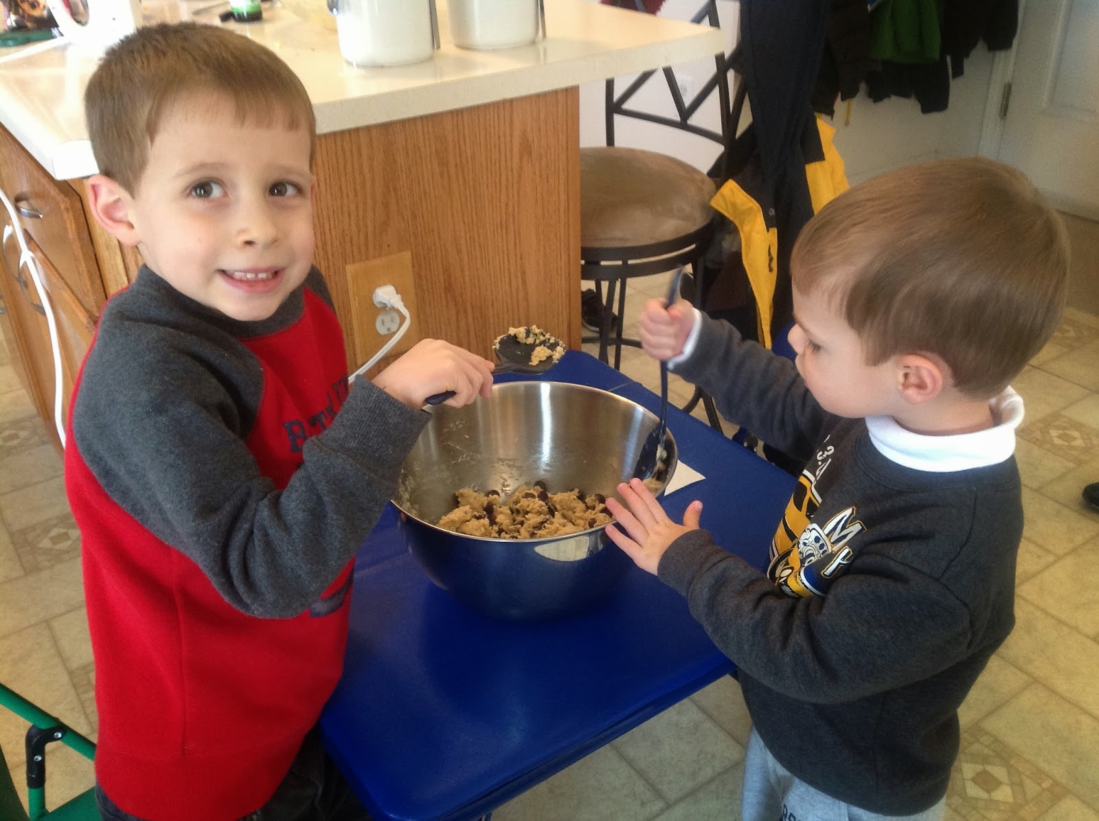 The boys helped me bake chocolate chip cookies today and they turned out so yummy! I have a horrible sweet tooth so I am glad we are baking these to give away. Of course we will have a few to share at home but the sooner they are eaten (by not me!) the better.